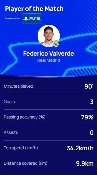 直播吧3月12日讯 欧冠1/8决赛首回合,皇马3-0战胜曼城。赛后,皇马中场巴尔韦德当选全场最佳球员。